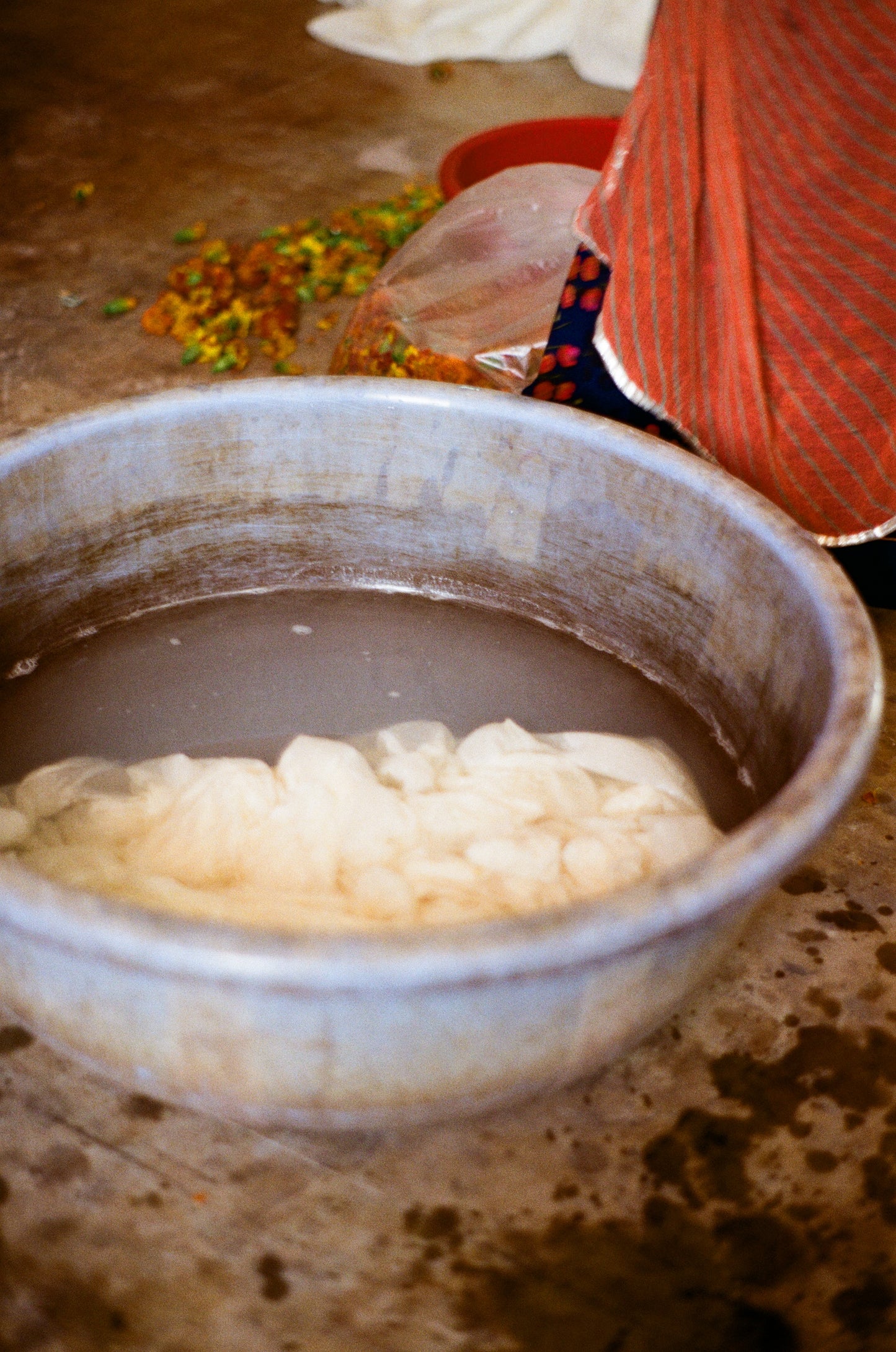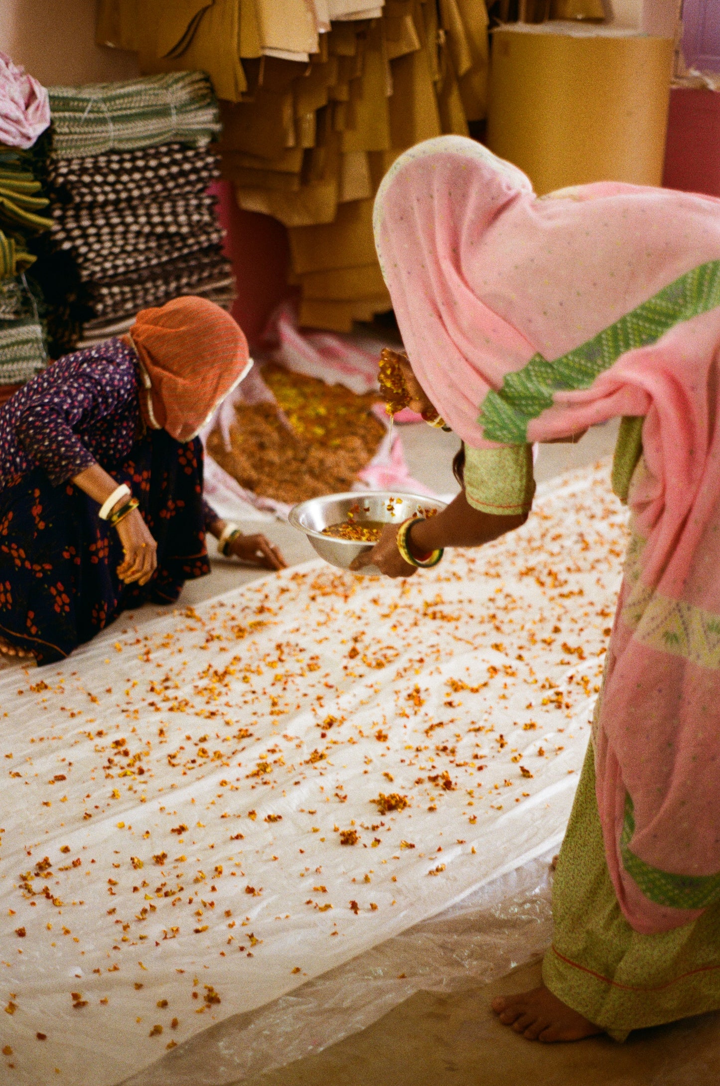 - Natural dyes bubbling over open fires, made from flowers, roots, and local minerals