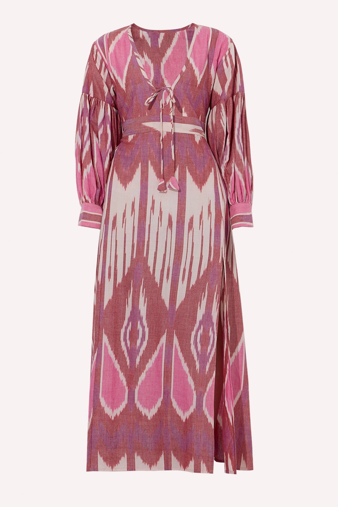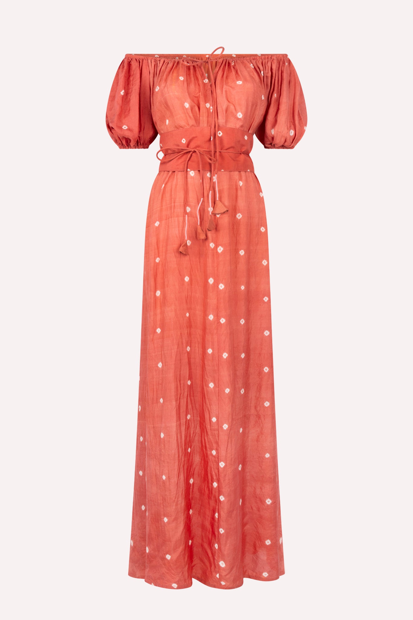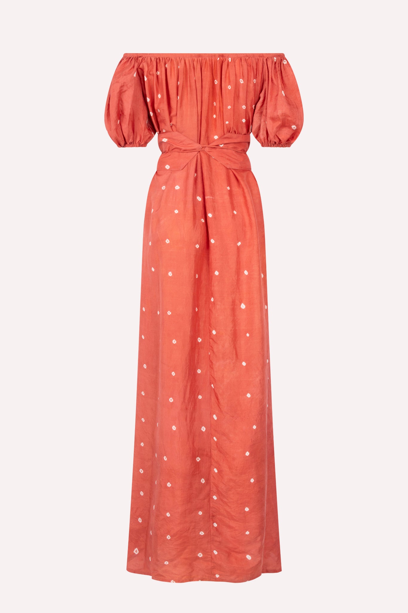 The Hibiscus dress begins with the intricate art of bandhani, creating delicate patterns that resist dye, before being steeped in madder and sappan wood to unveil radiant pinks and reds.