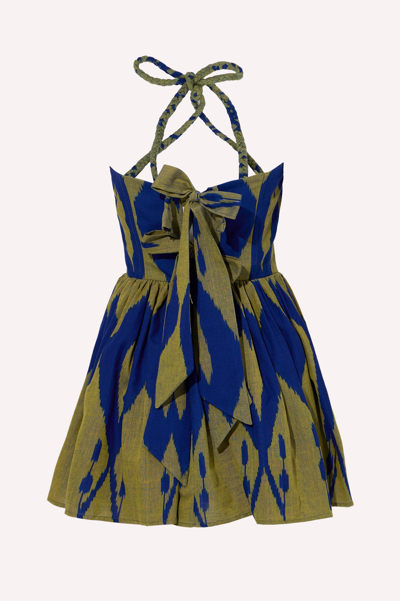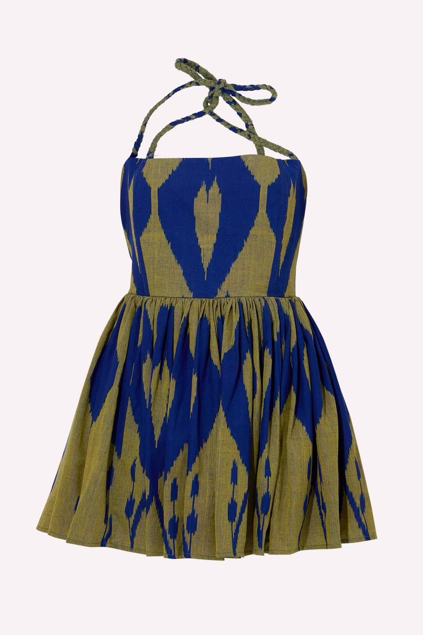 The Lotus dress radiates serenity, its hues crafted from Indigofera leaves, one of the world's most mystical natural dyes. A single dip creates soft sky blues, while double immersions conjure a profound indigo, reflecting the depth of the cosmos. Blue is the color of vastness and all-inclusiveness—like the endless sky and ocean—and in Indian tradition, many gods are depicted as blue not because of their skin, but as a reflection of their radiant aura. This sacred blue aura symbolizes the highest spiritual evolution, a state of profound wisdom and compassionate action in the world. In Hindu mythology, indigo is linked to Vishnu, who embodies balance, compassion, and the infinite cycles of life. Revered by ancient cultures and celebrated as a royal hue, indigo not only symbolizes divinity but also offers natural cooling and cleansing properties, making this dress a harmonious blend of sacred tradition and timeless beauty.
