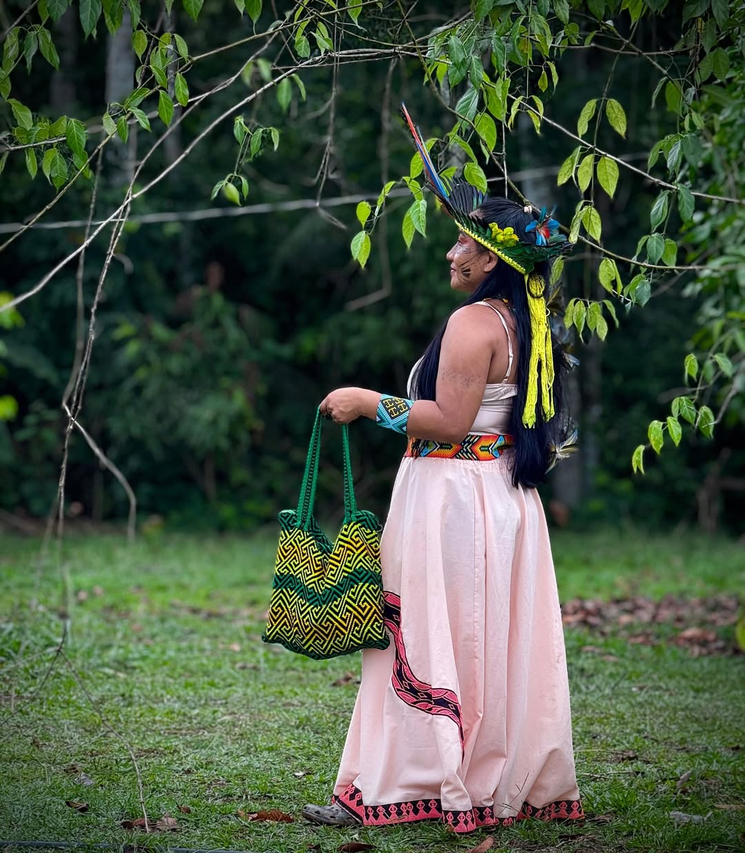 As a homage to the crafts that her sister loved, Samia is one of the co-ordinators and leaders of the women’s cultural group Xinã Raya Bena who aim to raise the feminine voices of the forest as safekeepers of the sacred. Breaking boundaries and borders of women’s roles in her community, she has become an inspiration for many indigenous Huni Kuin women around her on finding their power both spiritually and politically. Along with the other women in her village she cultivates intricate artwork and works with her indigenous tribe’s spiritual work, keeping the feminine force within their culture alive and strong.