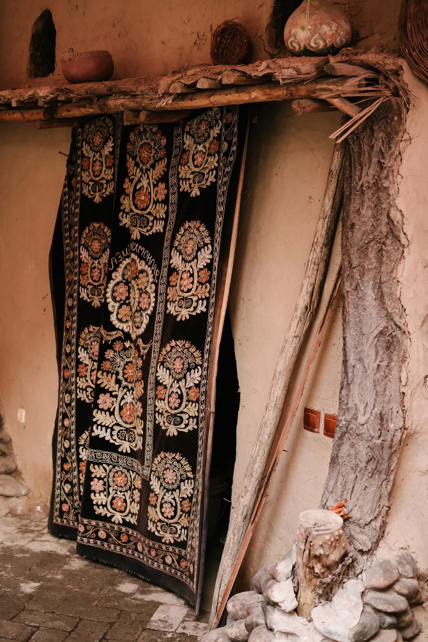 - Philosophy of communities of the Penjakent Valley: The black and white Suzani represents the philosophy of the region - life and death walking hand in hand, with the red flowers dancing in between representing moments of joy