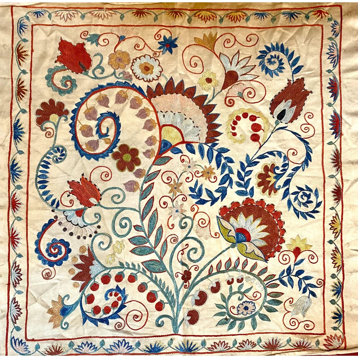 Suzani comes from the Persian word Suzan, meaning 'Needle'. It is an art form which spans across centuries of tradition and story-telling. A craft found in homes across Central Asia, safeguarded in countries such as Uzbekistan, Tajikistan and Kazakhstan. Using mostly a cotton base, the female masters of this craft use either silk or cotton to thread together mesmerising works of art, their richness of meaning and earth symbolism interwoven with each intentional stitch.